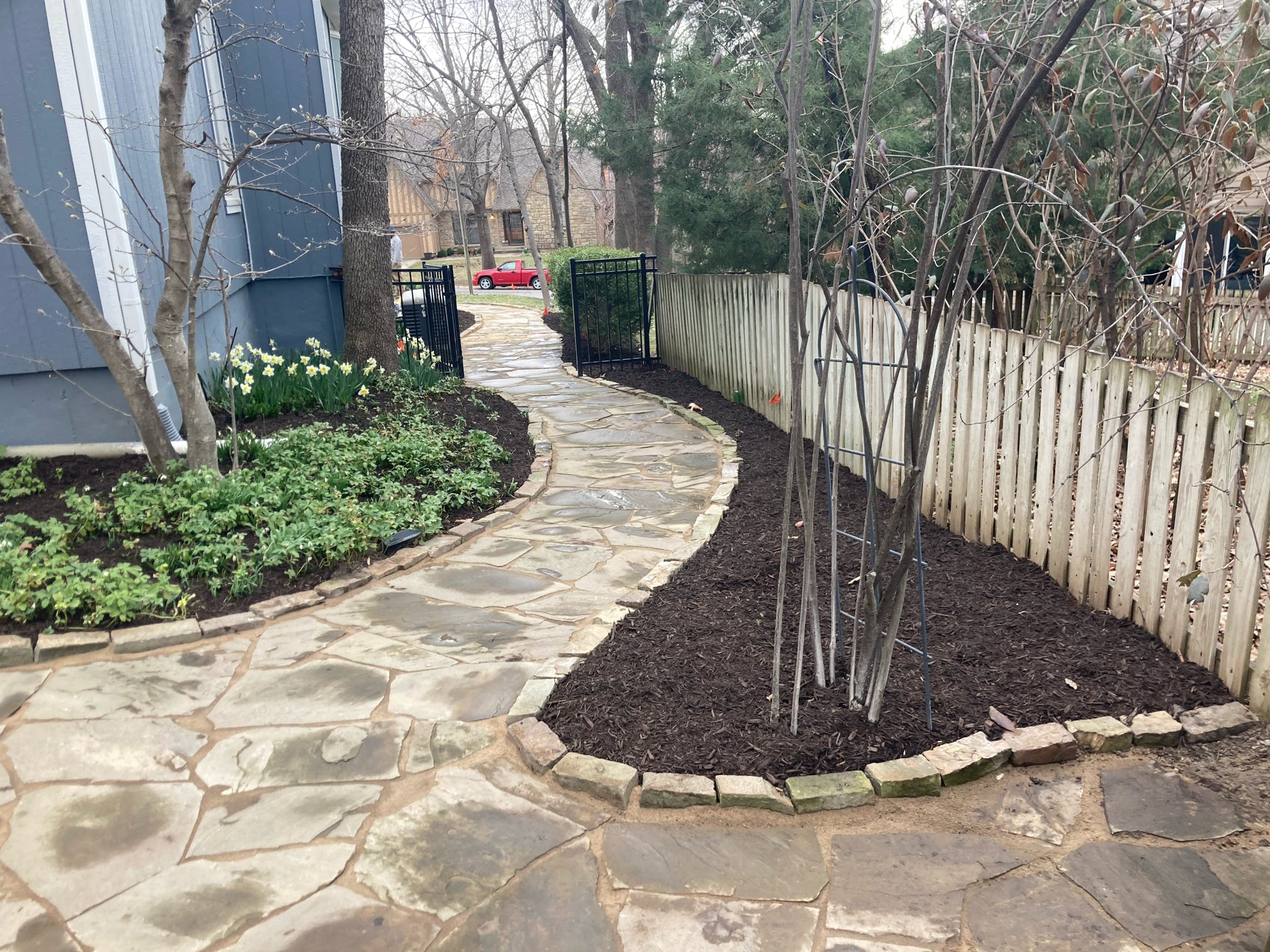 - Low-maintenance design: Native plant gardens, mulch beds, or stone pathways